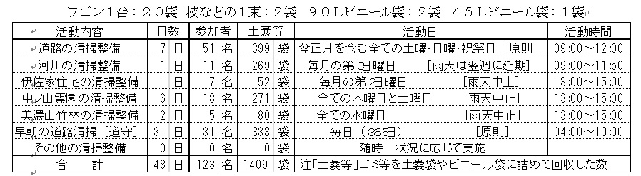 表は4月に行った八幡ルネの活動を示すもので、定例的に実施している清掃整備活動の延べ日数、延べ参加者数および清掃整備活動で回収したゴミなどの量を、次の土嚢袋に換算して記載しております。