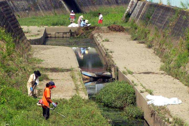 8月16日(日)は定例清掃日、草刈り機や人手による雑草処理が通常通りに始められたが、大谷川と放生川の境に設置された「水質浄化施設」手前の低水路には相当量の水草が繁茂し(写真奥)、悪臭と重さに戦いながら土嚢袋に詰め込む作業で、この日に参加したボランティアは12名、回収した土嚢袋が328袋で作業終了となりましたが、この日も低水路から放置自転車1台を引き揚げ、数日前に業者により葦を刈り取られた放生川には、捨てられたペットボトルや空き缶・ゴミが詰められたレジ袋などが目立ち、心痛む河川の状況でした。