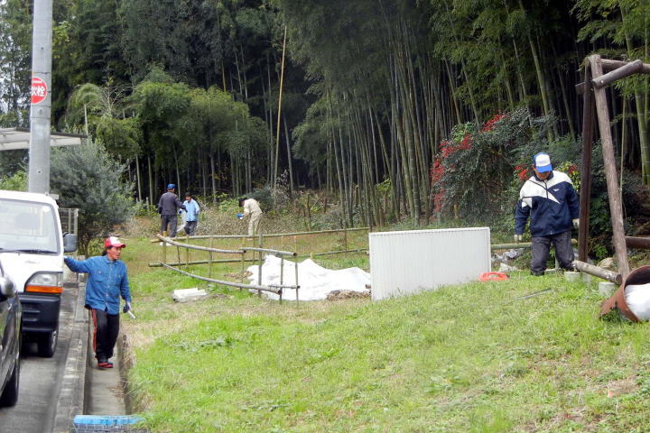 11月25日(水) この日の定例清掃整備は雨の予報、小雨が降ったり止んだりの天気の中、発電機に接続された電動チェーンソーと電動ノコギリはフル稼働、参加したボランティア6名は余分な竹を切り倒す作業や竹の一部は竹炭の原料に定寸に切断する作業、竹割り道具を用いて竹を四つ割りにする作業などを分担して行い、清掃整備に着手する前の状態から、着実に美しい竹林へと変わりつつありますが、満足していただける竹林になるは、まだ時間が掛かりそうです。