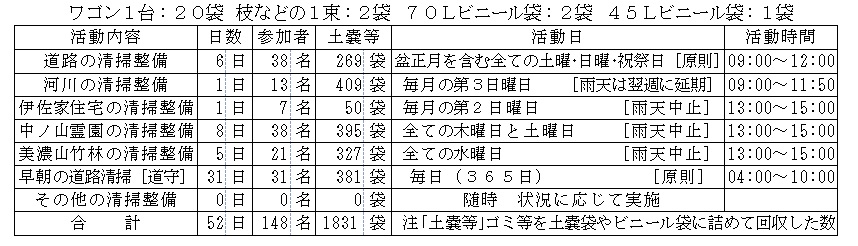 表は当月に行った八幡ルネの活動を示すものであり、定例的に実施している清掃整備活動の延べ日数、延べ参加者数および清掃整備活動で回収したゴミなどの量を、次の土嚢袋に換算して記載しております。