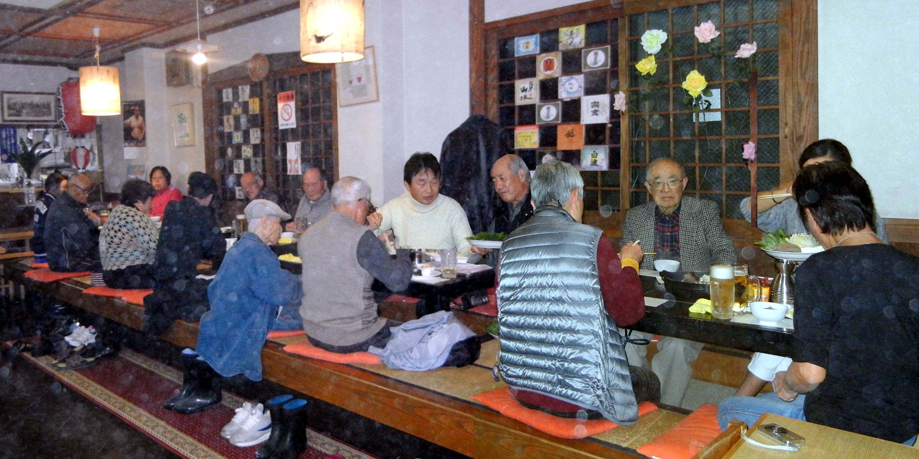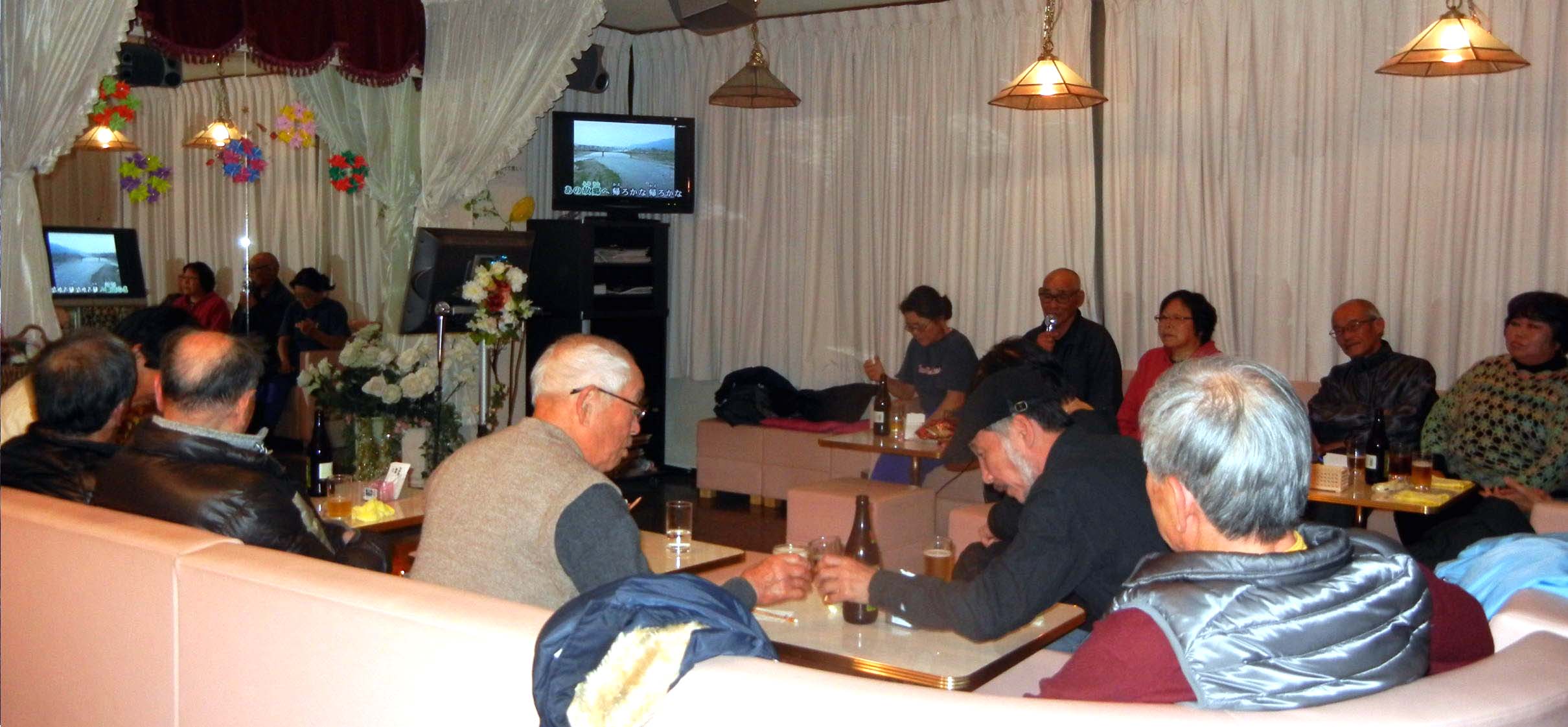 12月23日(祝)が定例となった八幡ルネの忘年会、雨の中を午後5時を過ぎた頃から参加者は三々五々お馴染みの「小谷食堂」に集合し始め、5時30分に代表の挨拶と乾杯で定刻通りスタート、すき焼きを食べながらビールなどの飲み物を片手に会話が弾み、昔を語る人、今を語る人、夢を語る人、そして弁舌に耳を傾ける人、今年もワイワイガヤガヤと笑顔と笑いの楽しい一時を満喫した後は、階上のカラオケへ移動する段取り、雨傘をお忘れなくの配慮を横目に、階上のカラオケ会場へ移動しました。