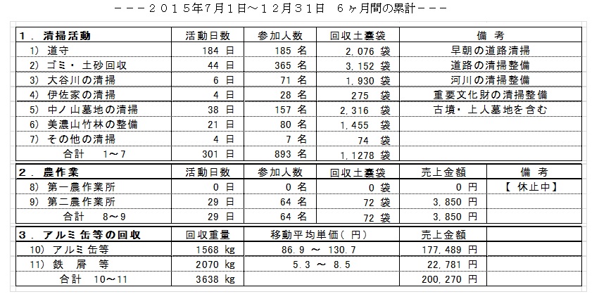 八幡ルネが行った6ヶ月間の「清掃活動」は延べ301日であり、893名の参加者で11000袋を超える土嚢袋に相当するゴミや土砂などを、次表に示す活動内容で回収して八幡市の美化に努めました。 これらの活動は、清掃時に行う「アルミ缶等の回収」による売却益と寄付金によって賄われており、皆様のご家庭で不要になったアルミ缶のご提供など、八幡ルネへのご支援をお願い申し上げます。