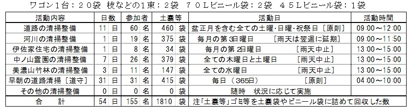 表は当月に行った八幡ルネの活動を示すものであり、定例的に実施している清掃整備活動の延べ日数、延べ参加者数および清掃整備活動で回収したゴミなどの量を、次の土嚢袋に換算して記載しております。